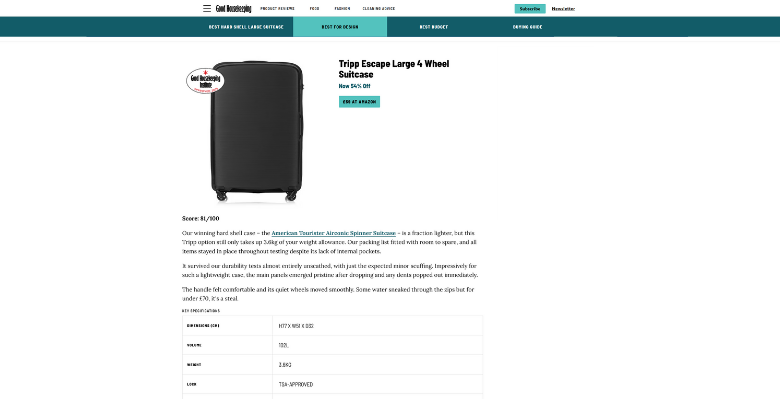 Tripp was featured in Good Housekeeping’s guide to the best suitcases for your next holiday, with our luggage praised for offering an outstanding balance of durability, practical features and sleek styling. Their experts highlighted the strength and stability of our hard shell designs, describing them as a dependable choice for frequent flyers and family travellers alike. With smooth wheels, secure locks and a variety of colour options, our cases were recommended as ideal companions for busy airports and baggage carousels. Whether you’re packing light or planning an extended trip, Tripp stood out as a reliable option that doesn’t compromise on performance or price.