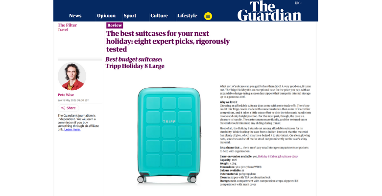 Tripp was featured in The Independent’s round-up of the best luggage brands in the UK, where we were recognised for combining style, quality and affordability. The piece praised Tripp as a go-to choice for travellers looking for reliable luggage that performs well without the high price tag. Our expandable designs were highlighted as especially useful for overpackers, offering the flexibility to fit in those last-minute extras.