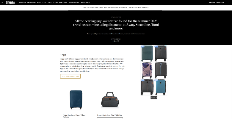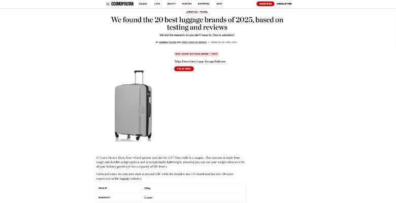 Condé Nast Traveller included Tripp in their guide to the best luggage deals, highlighting us as one of the top brands to watch for seasonal offers and promotions. They praised our ability to offer premium-feel suitcases at excellent value, especially during peak travel periods like summer. With sleek styling and practical design features, our luggage was recognised as a smart buy for travellers looking to upgrade without overspending, whether you’re shopping ahead of a trip or planning a last-minute getaway.